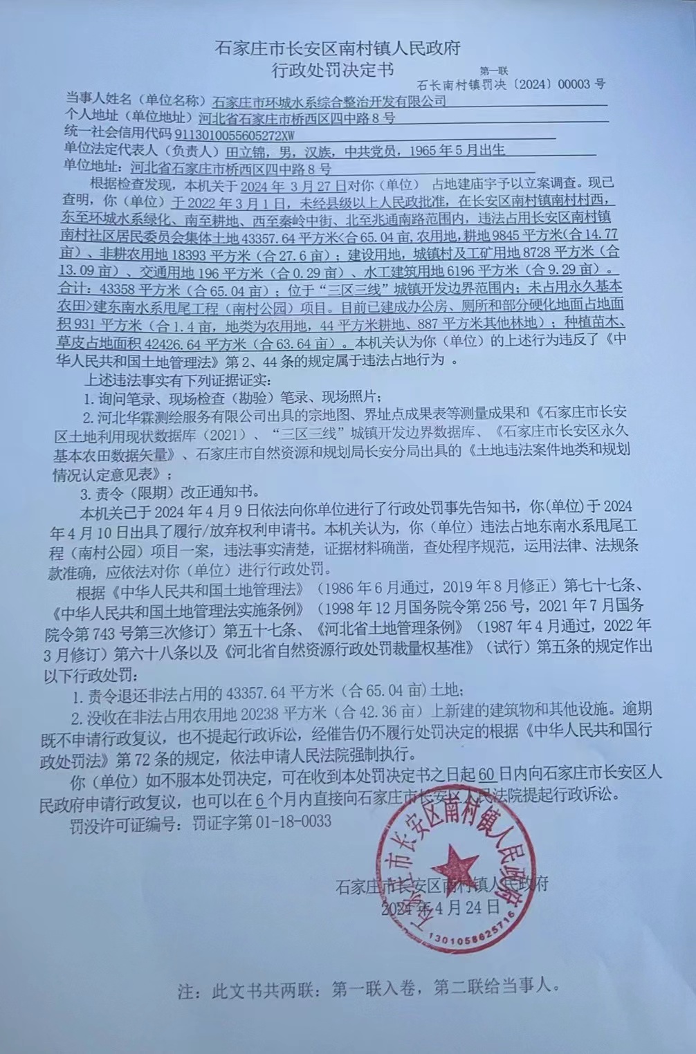 石家庄市环城水系综合整治开发有限公司未经县级以上人民政府批准,在长安区南村镇南村村西,东至环城水系绿化、南至耕地、西至秦岭中街、北至兆通南路范围内,违法占用长安区南村镇南村社区居民委员会集体土地43357.64平方米<合65.04亩,农用地,耕地9845平方米(合14.77亩)、非耕农用地18393平方米(合27.6亩);建设用地,城镇村及工矿用地8728平方米(合13.09亩)、交通用地196平方米(合0.29亩)、水工建筑用地6196平方米(合9.29亩)。合计:43358平方米(合65.04亩);位于“三区三线”城镇开发边界范围内;未占用永久基本农田>建东南水系甩尾工程(南村公园)项目。目前已建成办公房、厕所和部分硬化地面占地面积931平方米(合1.4亩,地类为农用地,44平方米耕地、887平方米其他林地);种植苗木、草皮占地面积42426.64平方米(合63.64亩)违反了《中华人民共和国土地管理法》第2、44条的规定属于违法占地行为,根据《中华人民共和国土地管理法》(1986年6月通过,2019年8月修正)第七十七条、《中华人民共和国土地管理法实施条例》(1998年12月国务院令第256号,2021年7月国务院令第743号第三次修订)第五十七条、《河北省土地管理条例》(1987年4月通过,2022年3月修订)第六十八条以及《河北省自然资源行政处罚裁量权基准(试行)》第五条的规定,责令退还非法占用的43357.64平方米(合65.04亩)土地;没收在非法占用农用地20238平方米(合42.36亩)上新建的建筑物和其他设施。