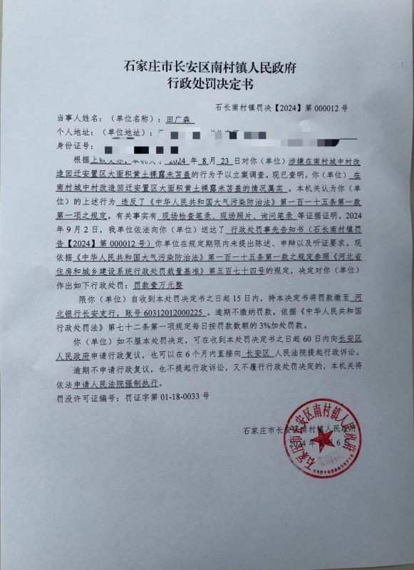 2024年8月22日,我镇接到长安区住房和城区建设局交办问题田广森涉嫌在南村城中村改造回迁安置区大面积黄土裸露未苫盖,土方作业未施法作业,道路浮土严重。接到此问题后我镇执法人员立即前往现场调查取证,证实此情况属实,依据《中华人民共和国大气污染防治法》第一百一十五条第一款第一项,涉嫌违反《中华人民共和国大气污染防治法》第六十九条第三款之规定。现依据《中华人民共和国大气污染防治法》第一百一十五条第一款参照《河北省乡镇和街道综合执法自由裁量基准》第一批下放的第4项之规定,因其及时改正未造成其他影响,建议对当事人处以罚款壹万元整的行政处罚。