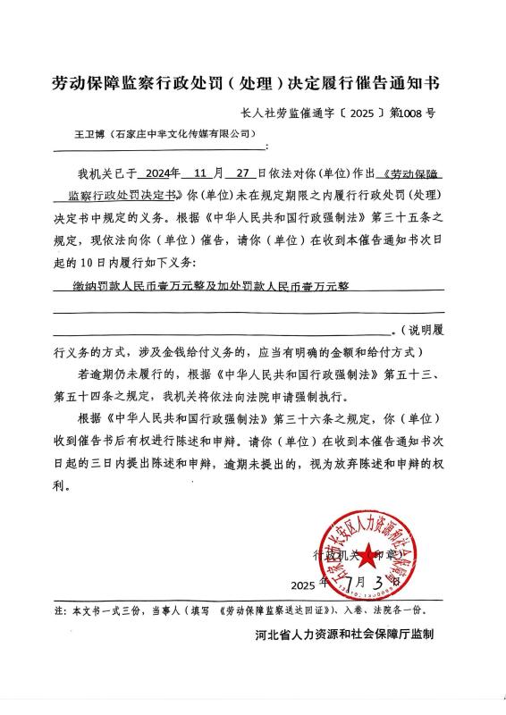 关于向“王卫博石家庄中芈文化传媒有限公司”送达劳动保障行政处罚(处理)决定履行催告通知书的公告