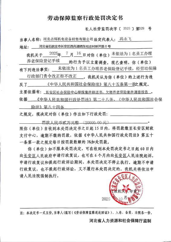 关于向“河北占辉机电设备销售有限公司送达劳动保障监察行政处罚决定书”的公告(未依法为1名员工办理养老保险登记手续案)