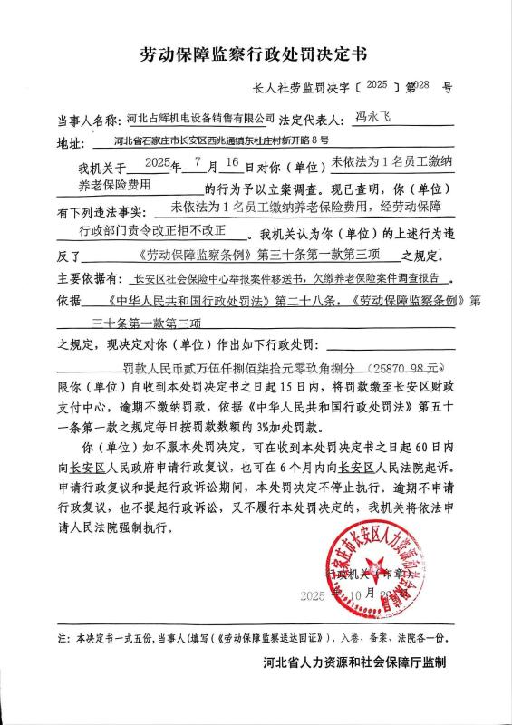 关于向“河北占辉机电设备销售有限公司送达劳动保障监察行政处罚决定书”的公告(未依法为1名员工缴纳养老保险费用案)