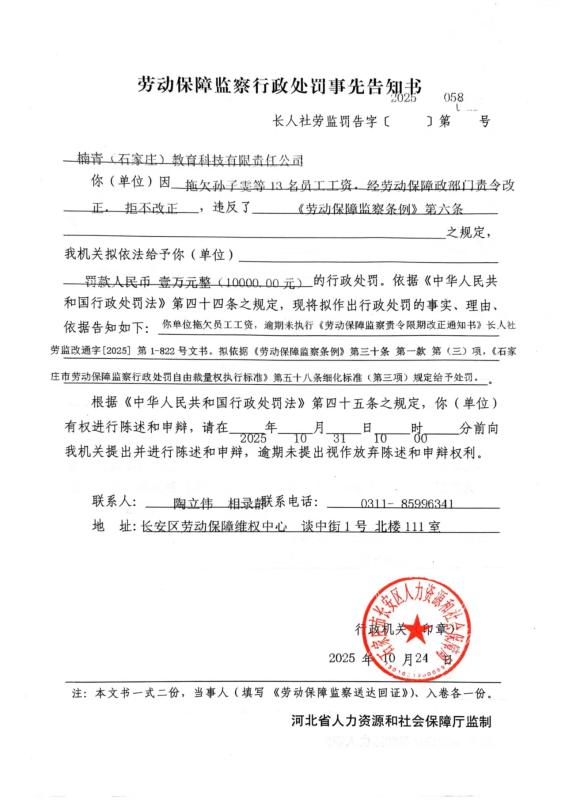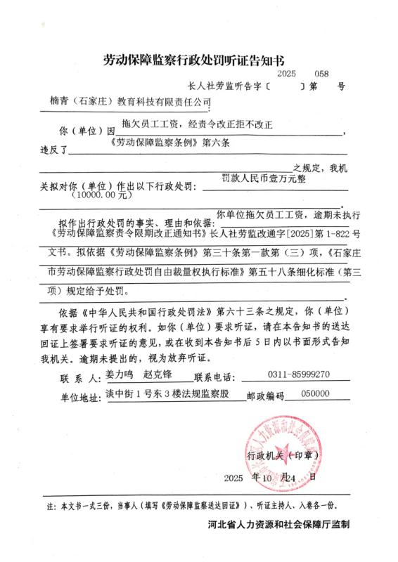关于向“楠青(石家庄)教育科技有限责任公司”送达劳动保障监察行政处罚事先告知书和劳动保障监察行政处罚听证告知书的公告