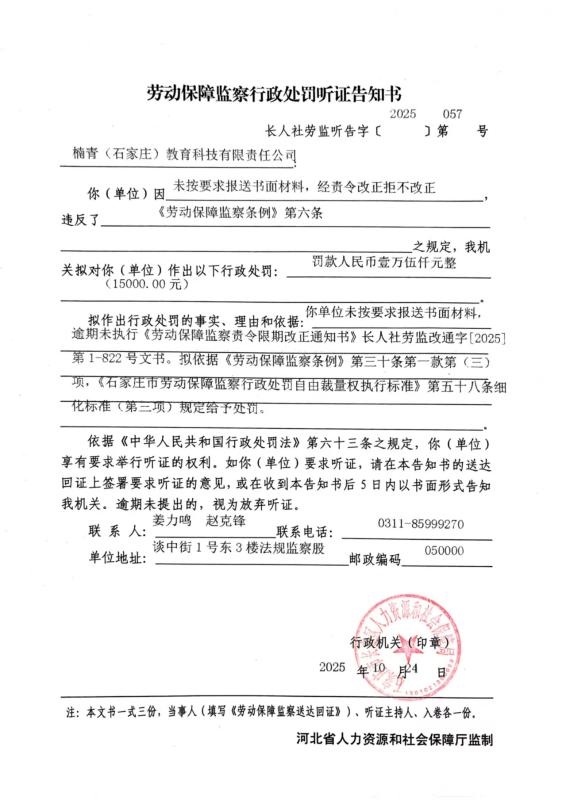 关于向“楠青(石家庄)教育科技有限责任公司”送达劳动保障监察行政处罚事先告知书和劳动保障监察行政处罚听证告知书的公告