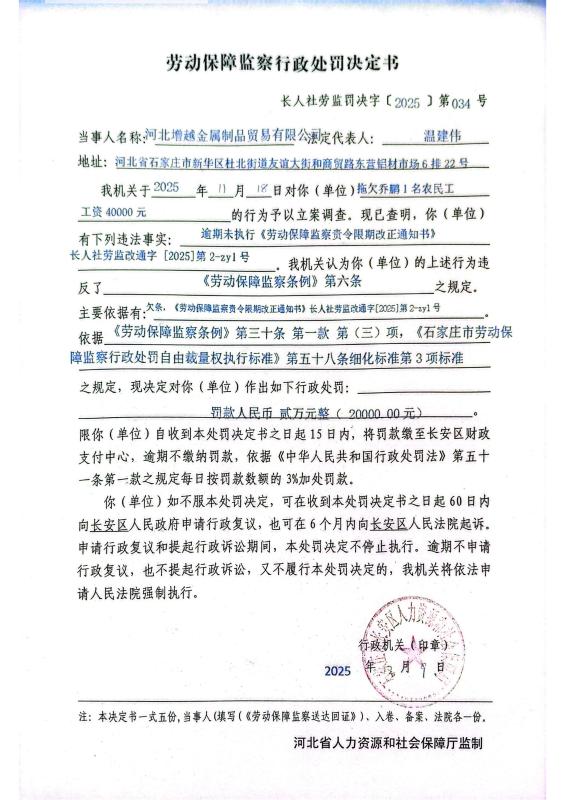 河北增越金属制品贸易有限公司拖欠员工工资案
