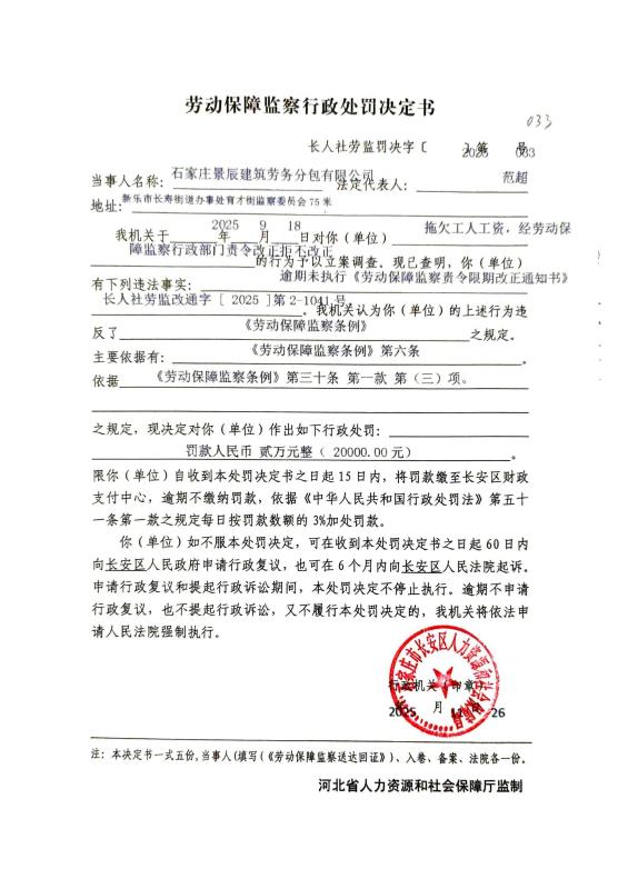 石家庄景辰建筑劳务分包有限公司拖欠工人工资责令改正拒不改正案