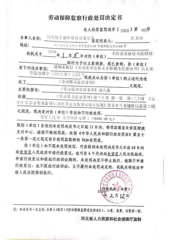 河北锦亭茶叶贸易有限公司未按要求报送书面材料案