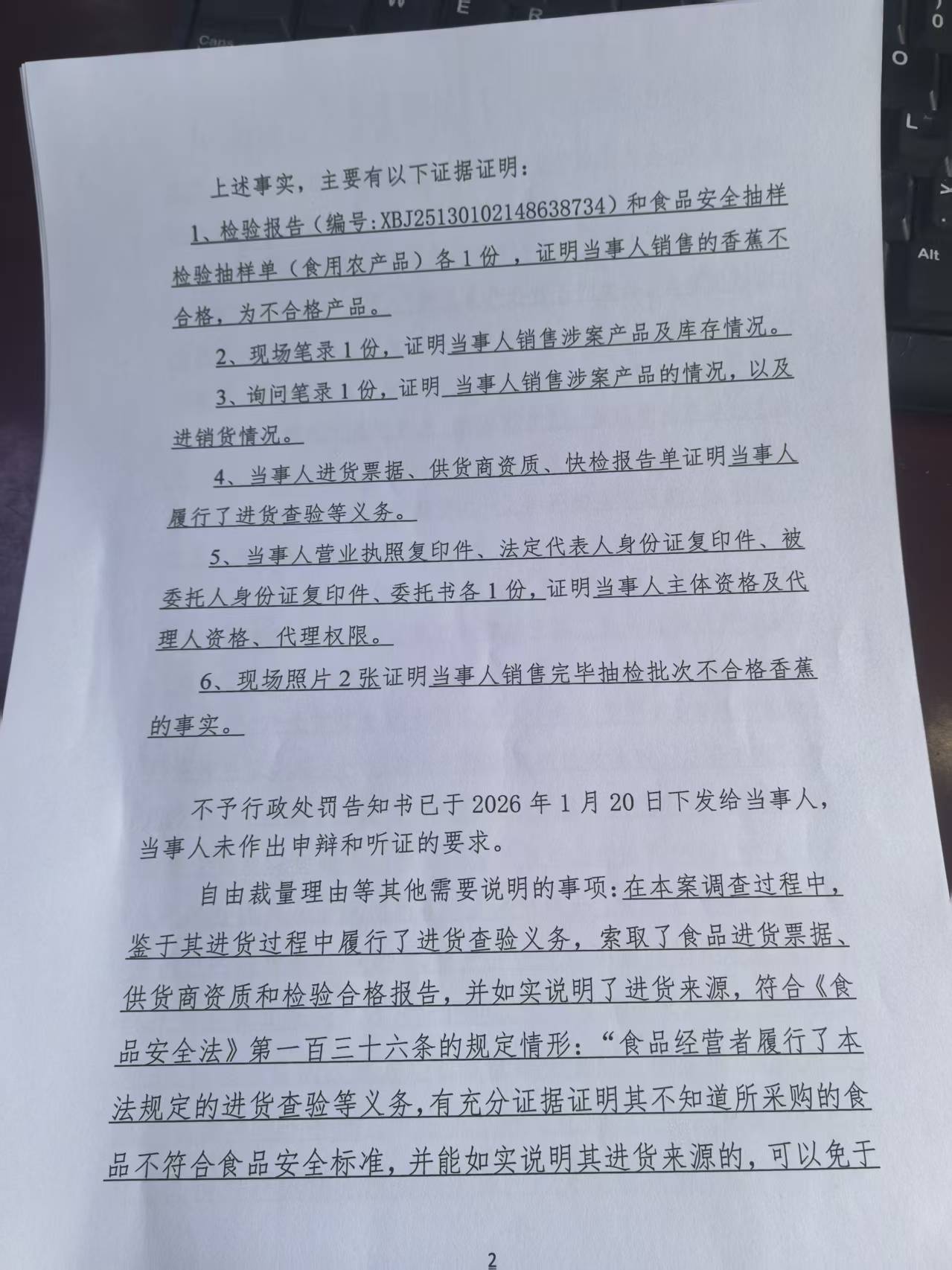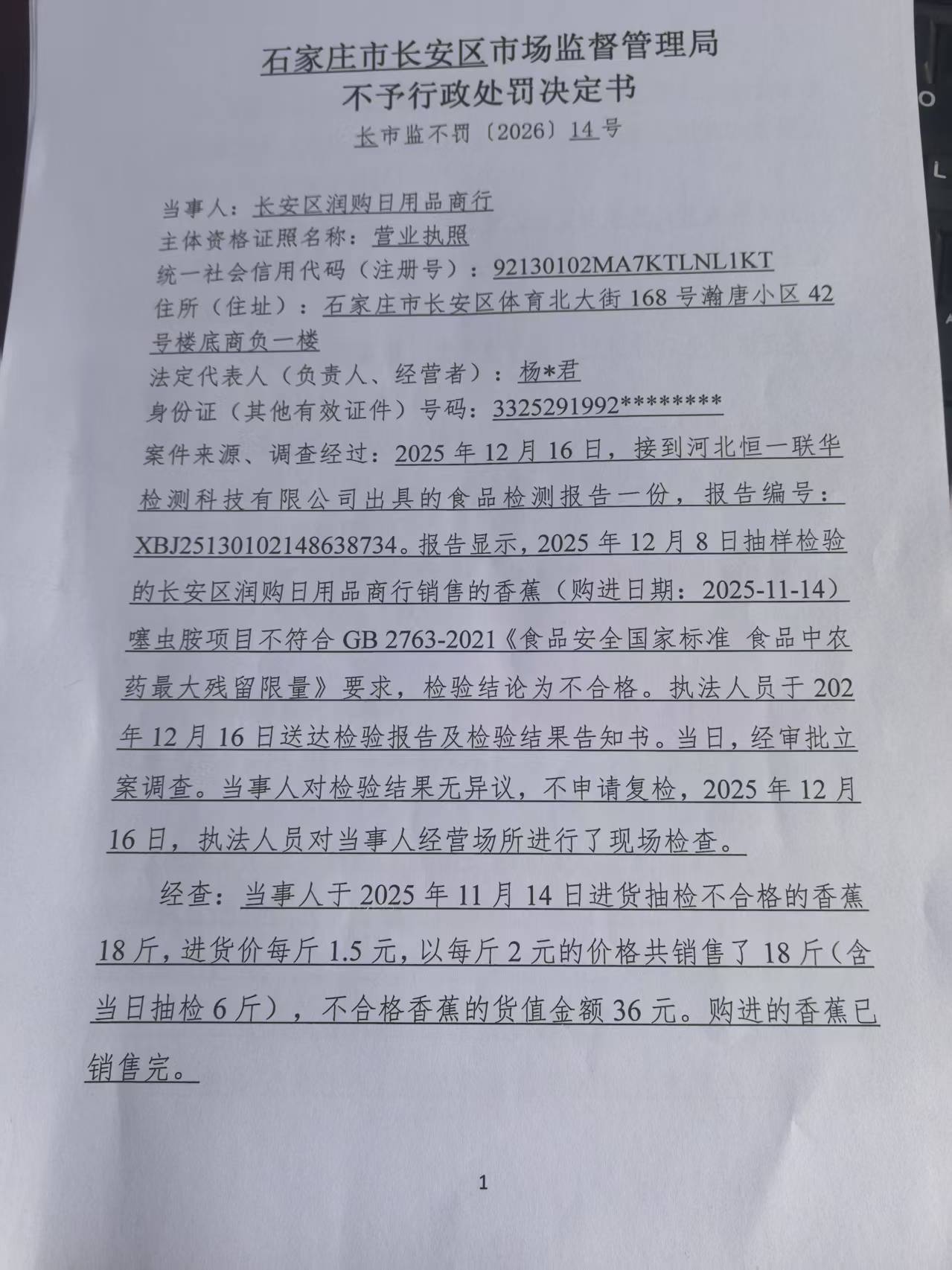长安区润购日用品商行(杨丽君)销售香蕉抽检不合格案