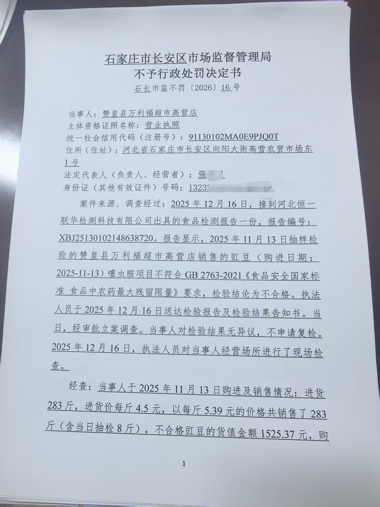 赞皇县万利福超市高营店销售抽检不合格豇豆案