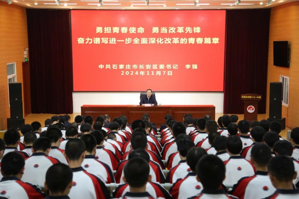 11月7日,区委书记李强到八十一中学,现场观摩了校史馆、河北省心理健康活动中心、校本课程展示等,随后为广大师生讲授思政课,宣讲党的二十届三中全会精神,动员广大青年学生勇担青春使命、勇当改革先锋,奋力谱写进一步全面深化改革的青春篇章。