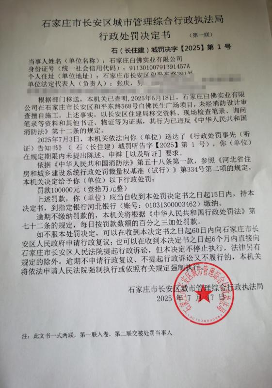 2025年6月18日,石家庄白佛实业有限公司在石家庄市长安区和平东路568号白佛民生广场项目,未经消防设计审查擅自施工 | ||