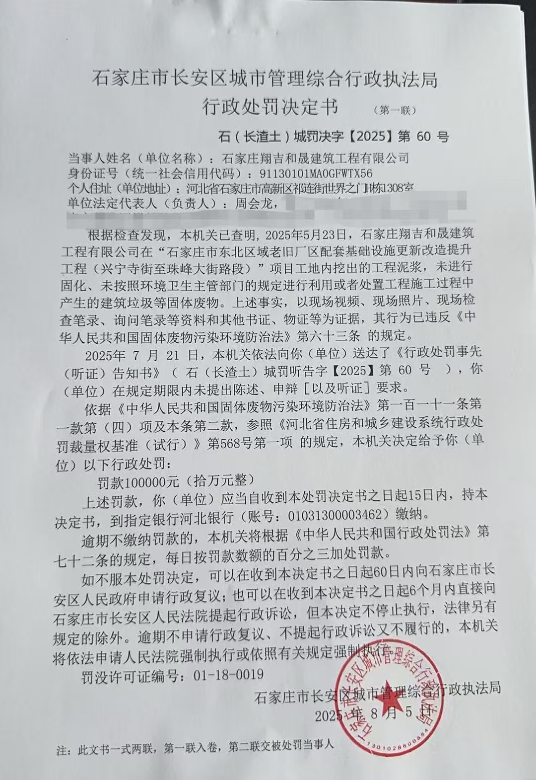 2025年5月23日,石家庄翔吉和晟建筑工程有限公司在“石家庄市东北区域老旧厂区配套基础设施更新改造提升工程(兴宁寺街至珠峰大街路段)”项目工地内挖出的工程泥浆,未进行固化、未按照环境卫生主管部门的规定进行利用或者处置工程施工过程中产生的建筑垃圾等固体废物 | ||