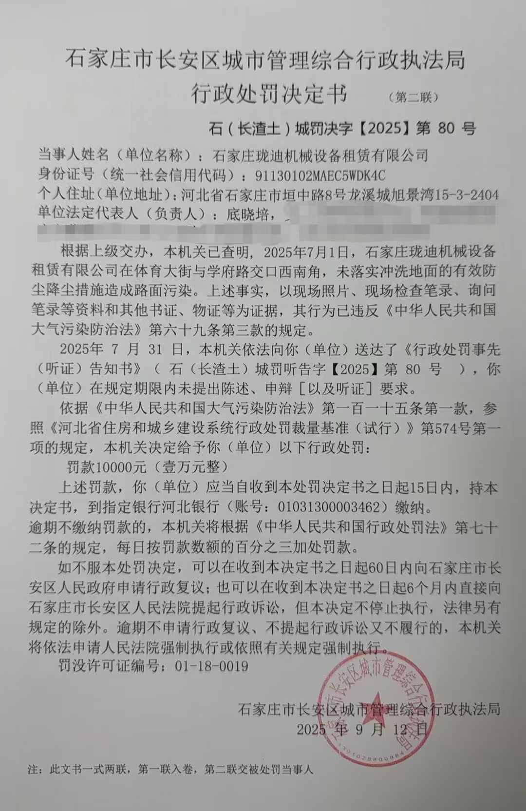 2025年7月1日,石家庄珑迪机械设备租赁有限公司在体育大街与学府路交口西南角,未落实冲洗地面的有效防尘降尘措施造成路面污染 | ||