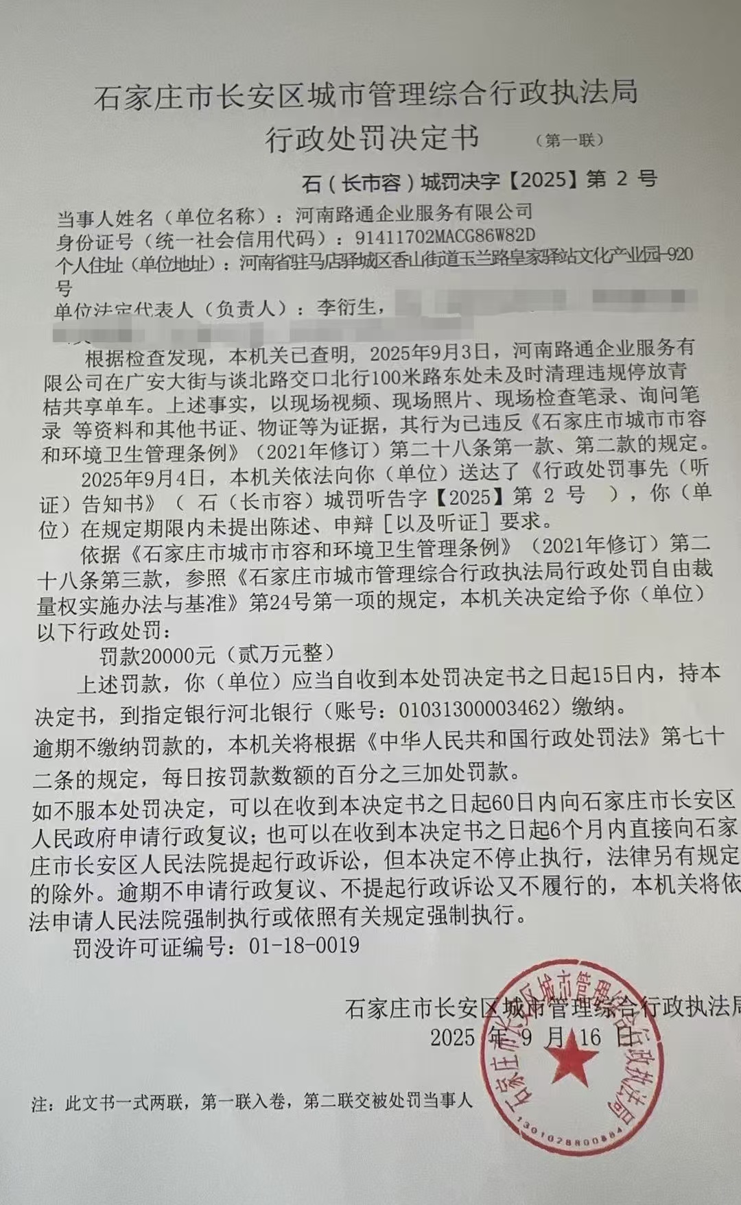 依据《石家庄市城市市容和环境卫生管理条例》(2021年修订)第二十八条第三款,参照《石家庄市城市管理综合行政执法局行政处罚自由裁量权实施办法与基准》第24号第一项 | ||