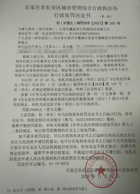2025年9月6日,石家庄鑫磊再生资源利用有限公司在建华北大街与东垣东路交口西南角,未落实冲洗地面的有效防尘降尘措施造成路面污染 | ||
