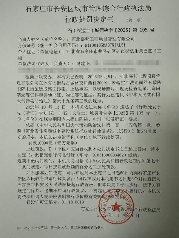 2025年9月9日,河北嘉邦工程项目管理有限公司在体育大街与古城路交口西行200米,未落实冲洗地面的有效防尘降尘措施造成路面污染 | ||