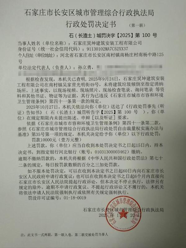 石家庄炅坤建筑安装工程有限公司未将建筑垃圾倾倒至指定消纳场所(渣土100)