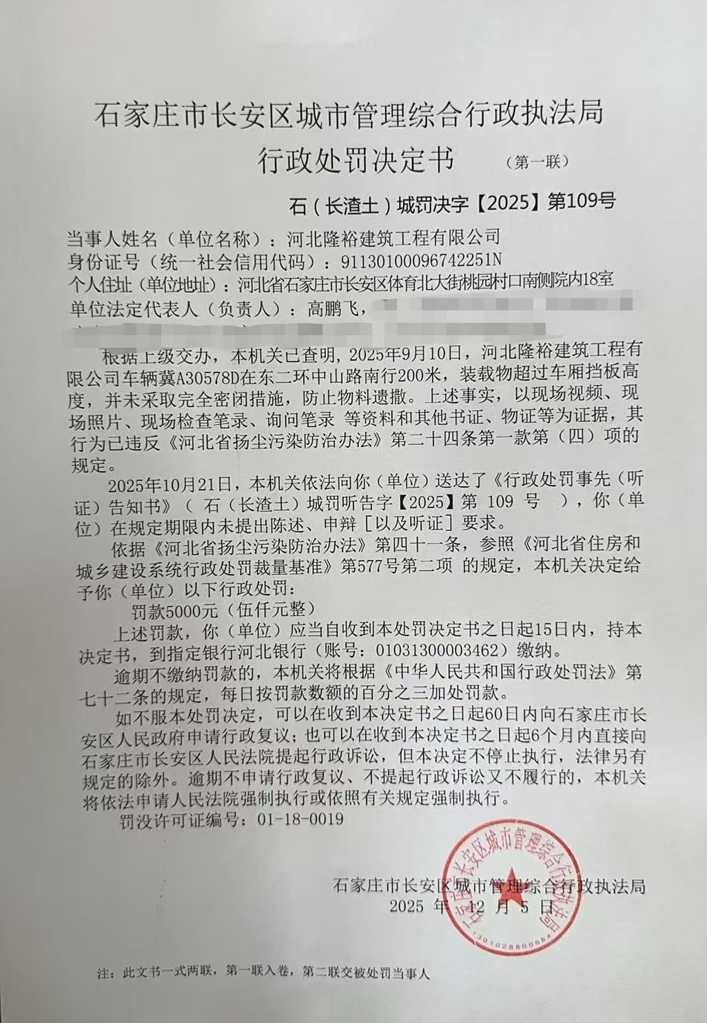 河北隆裕建筑工程有限公司装载物超过车厢挡板高度,并未采取完全密闭措施,防止物料遗撒(渣土109)