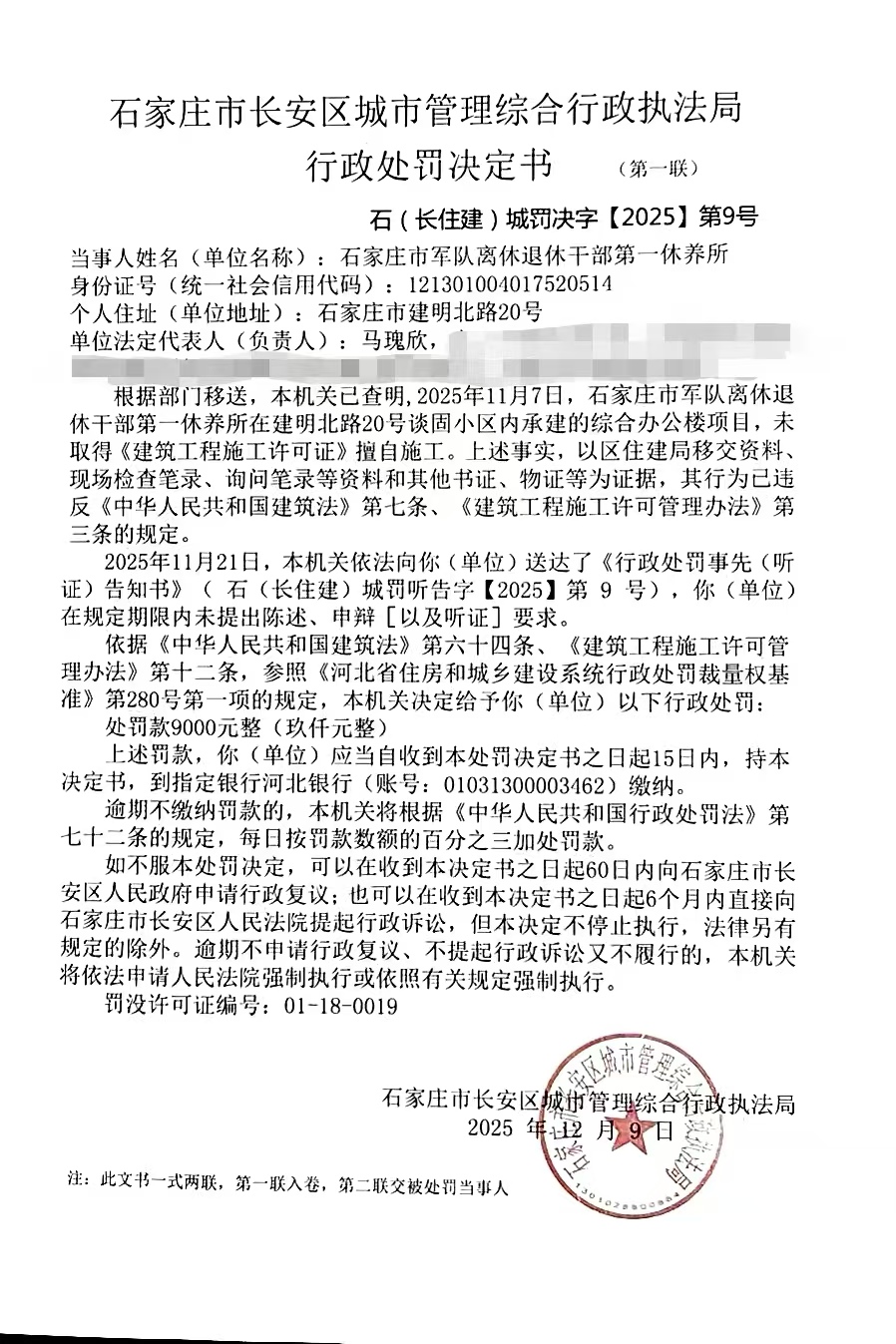 2025年11月7日,石家庄市军队离休退休干部第一休养所在建明北路20号谈固小区内承建的综合办公楼项目,未取得《建筑工程施工许可证》擅自施工 | ||