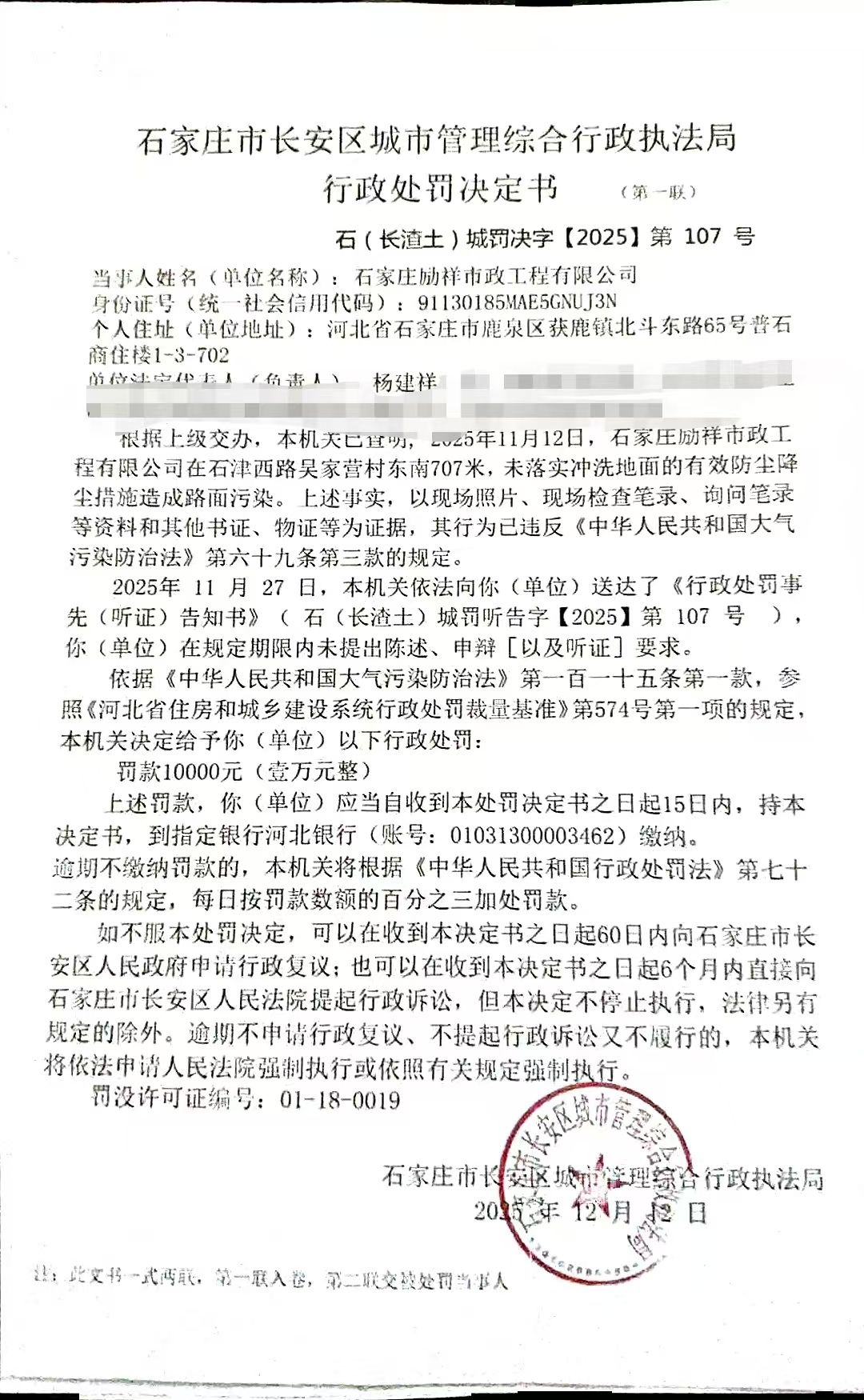 2025年11月12日,石家庄励祥市政工程有限公司在石津西路吴家营村东南707米,未落实冲洗地面的有效防尘降尘措施造成路面污染 | ||