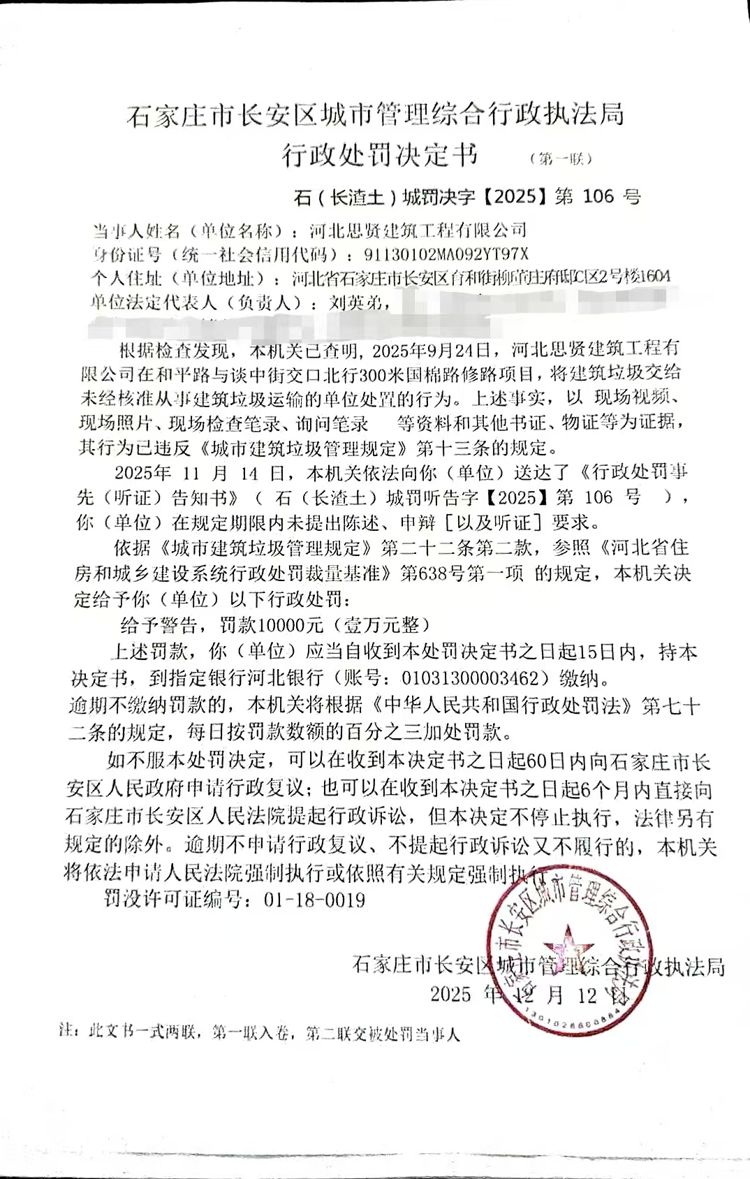 河北思贤建筑工程有限公司将建筑垃圾交给未经核准从事建筑垃圾运输的单位处置的行为(渣土106)
