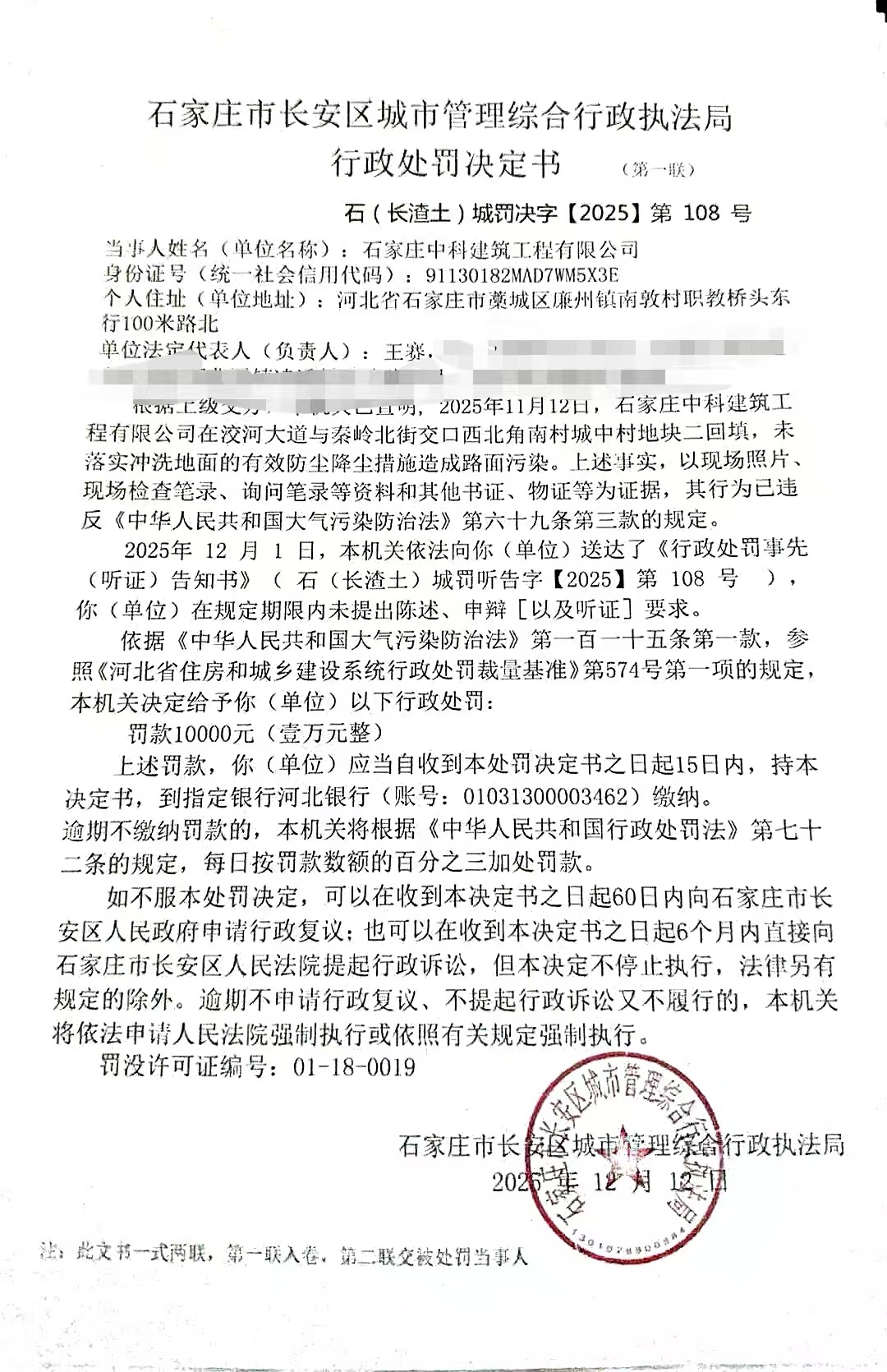 石家庄中科建筑工程有限公司未落实冲洗地面的有效防尘降尘措施造成路面污染(渣土108)