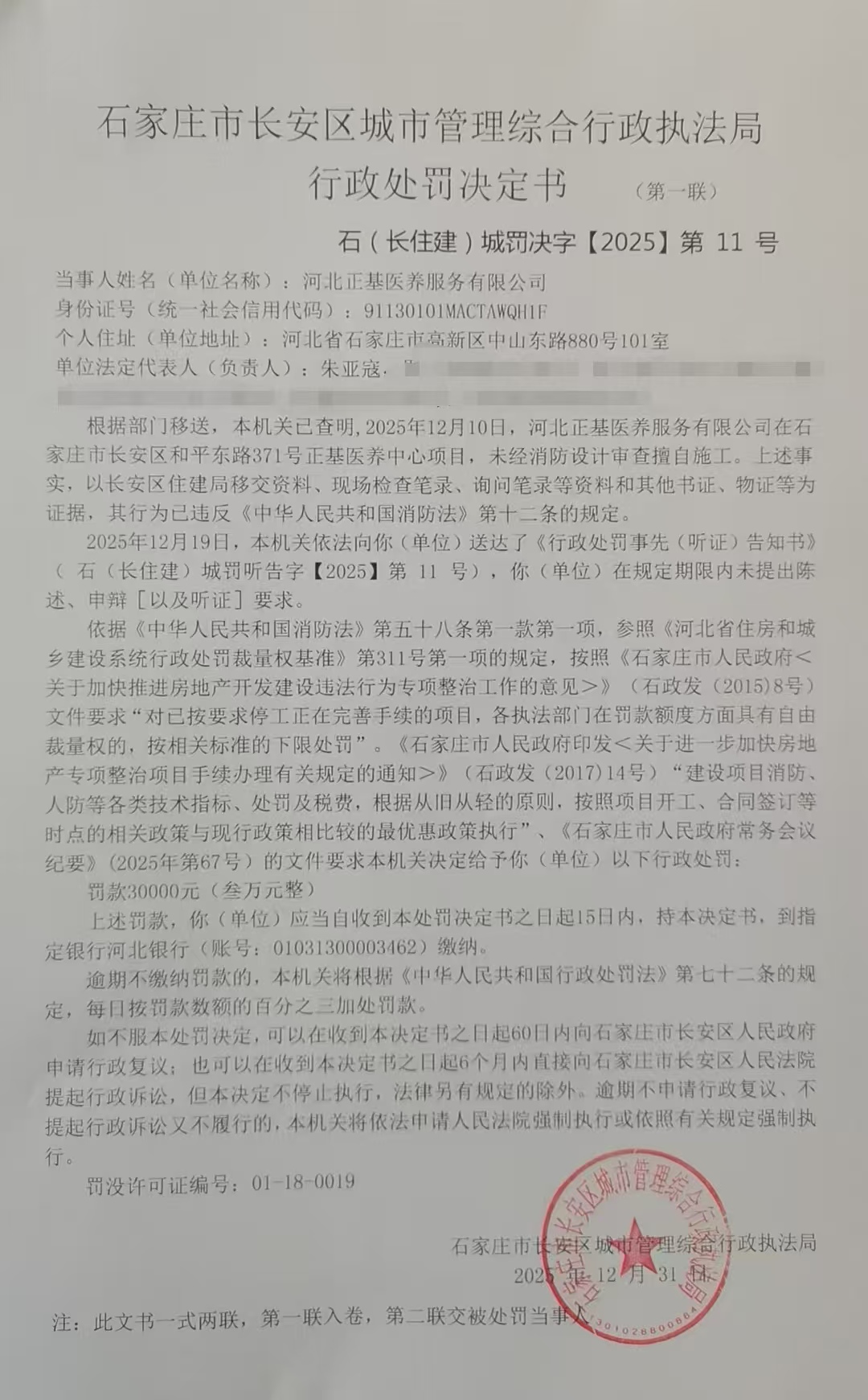 2025年12月10日,河北正基医养服务有限公司在石家庄市长安区和平东路371号正基医养中心项目,未经消防设计审查擅自施工 | ||