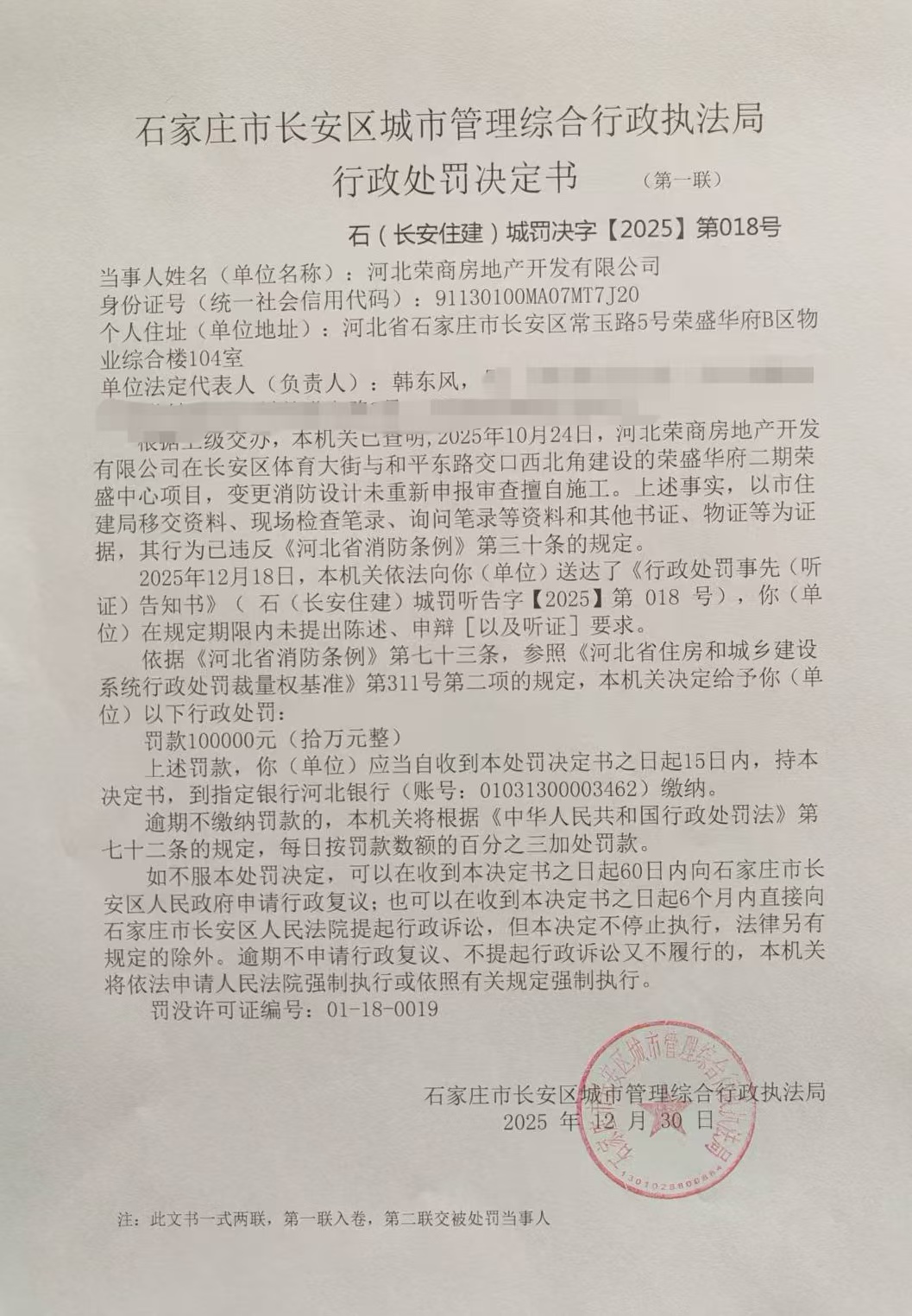 2025年10月24日,河北荣商房地产开发有限公司在长安区体育大街与和平东路交口西北角建设的荣盛华府二期荣盛中心项目,变更消防设计未重新申报审查擅自施工 | ||