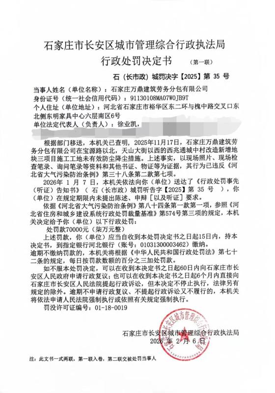石家庄万鼎建筑劳务分包有限公司未依法采取有效措施防治扬尘污染(市政35号)