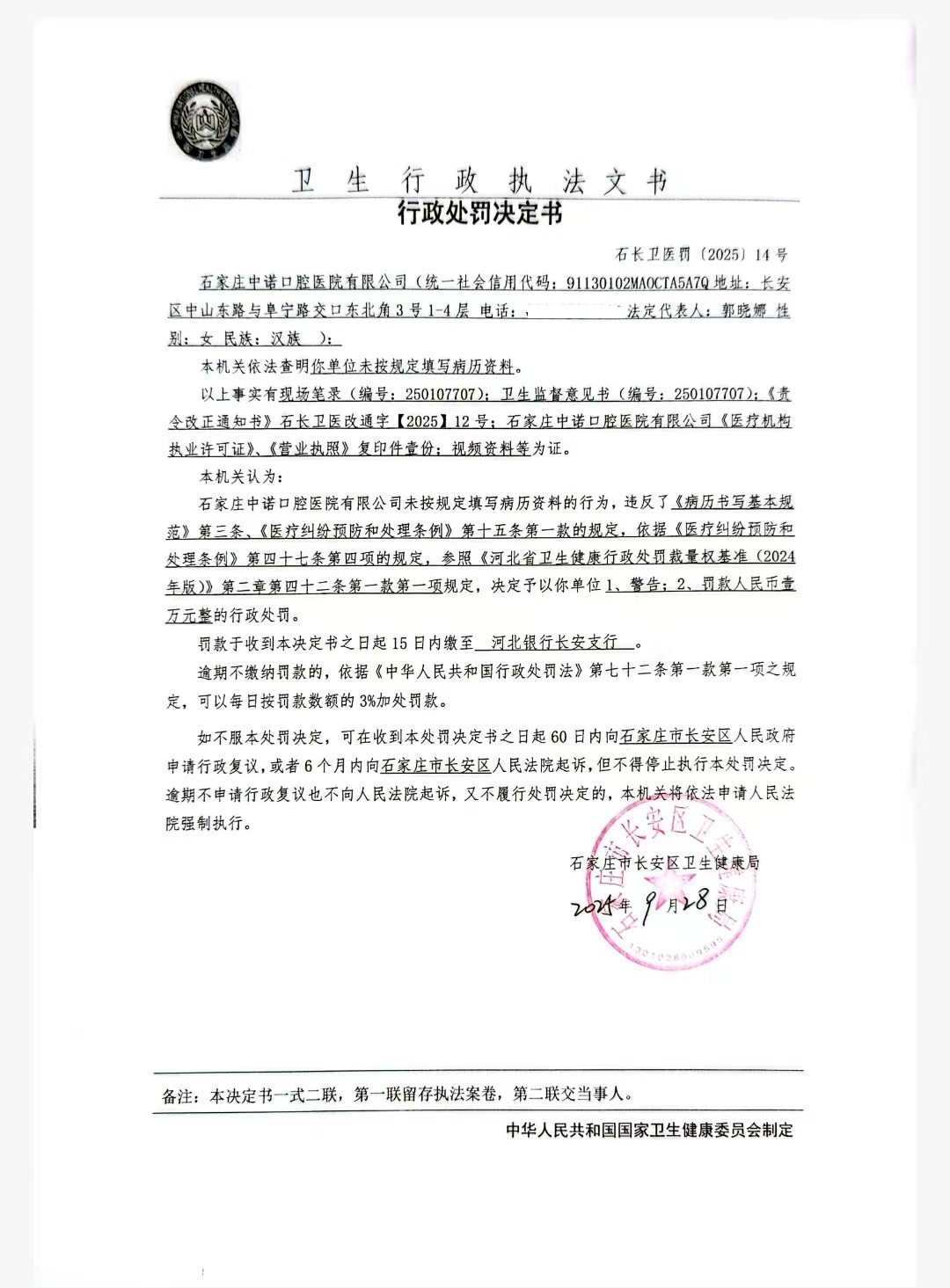 石家庄中诺口腔医院有限公司未按规定填写病历资料案
