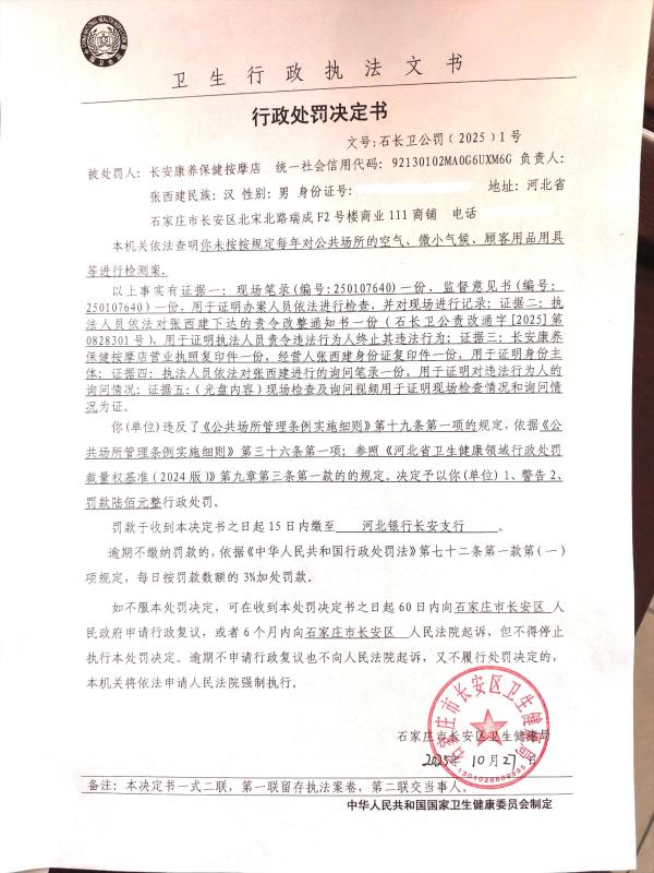 长安康养保健按摩店未按规定每年对公共场所的空气、微小气候、顾客用品用具等进行检测案