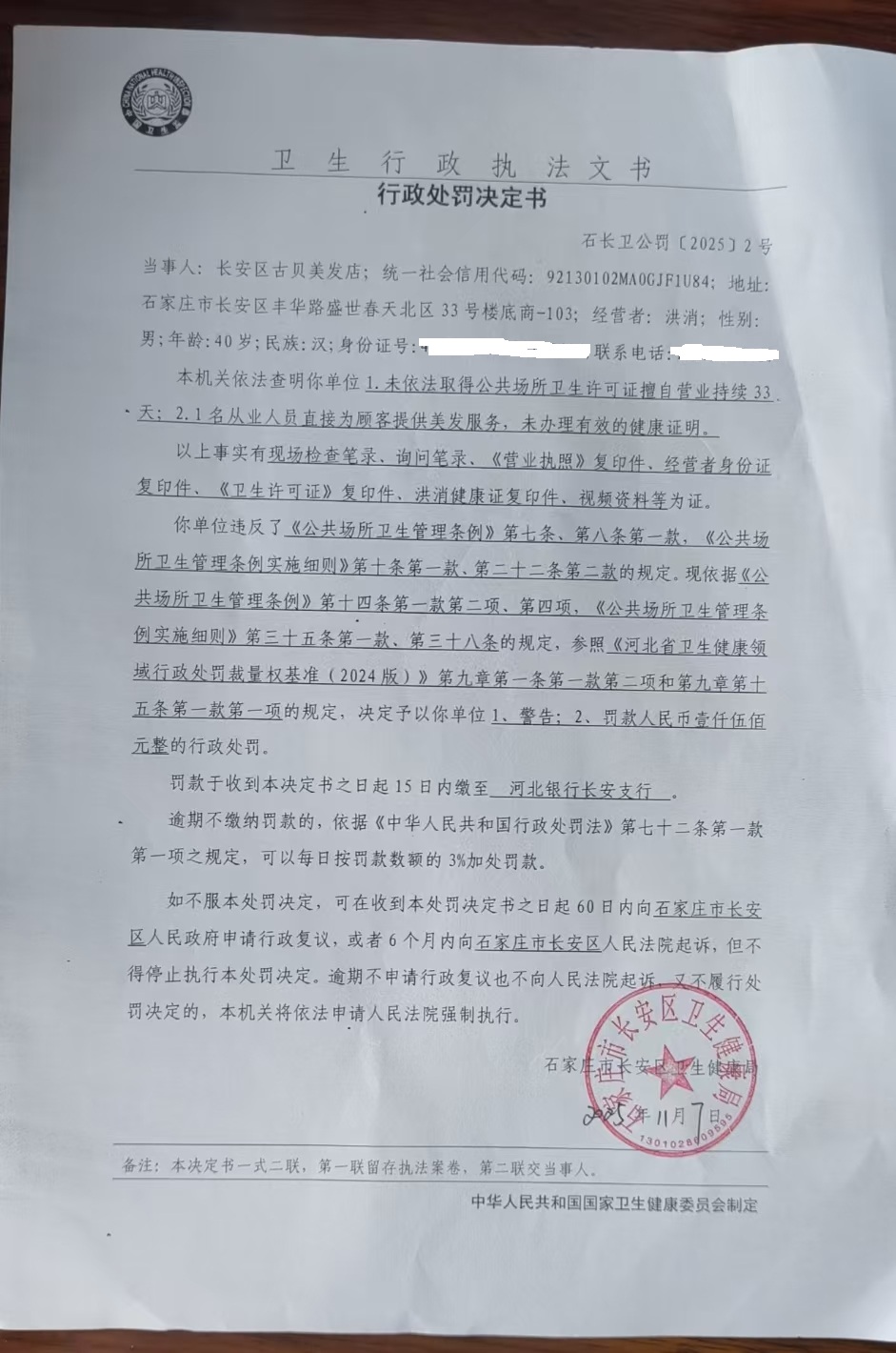 长安区古贝美发店未依法取得公共场所卫生许可证擅自营业等案