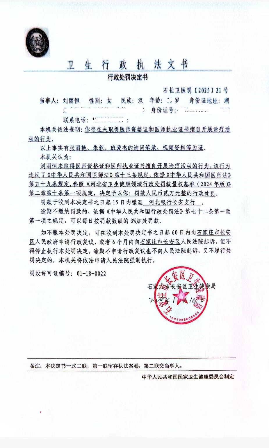 刘丽恒未取得医师资格证和医师执业证书擅自开展诊疗活动案