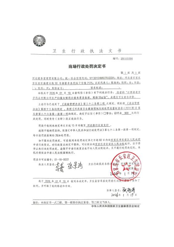 河北健参堂商贸有限公司经营卫生质量不符合要求的消毒产品案