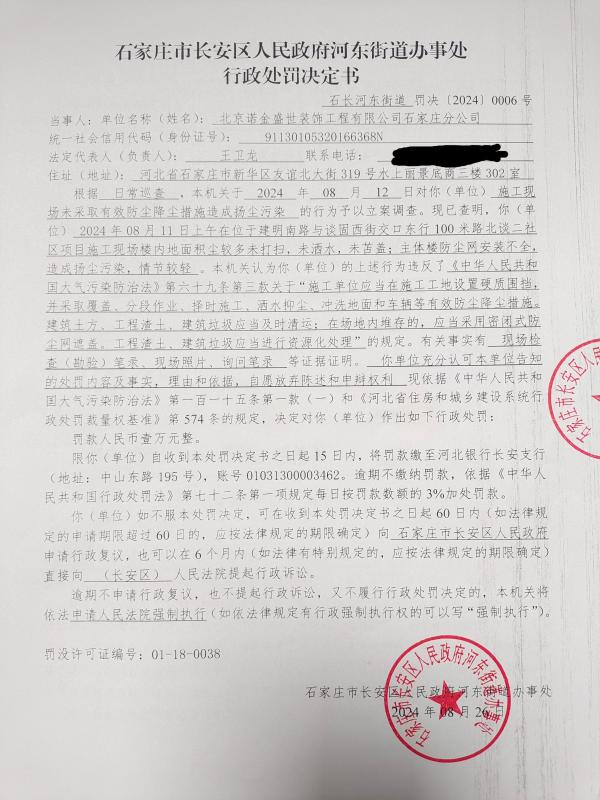 2024年8月11日上午,我街道综合行政执法队执法人员在日常巡查中,发现北京诺金盛世装饰工程有限公司石家庄分公司承建的位于建明南路与谈固西街交口东行100米路北谈二社区项目施工现场楼内地面积尘较多未打扫,未洒水,未苫盖;主体楼防尘网安装不全,造成扬尘污染,情节较轻。违反了《中华人民共和国大气污染防治法》第六十九条第三款,依据《中华人民共和国大气污染防治法》第一百一十五条第一款(一)和《河北省住房和城乡建设系统行政处罚裁量权基准》第574条的规定,决定对北京诺金盛世装饰工程有限公司石家庄分公司作出罚款人民币壹万元整的行政处罚。
