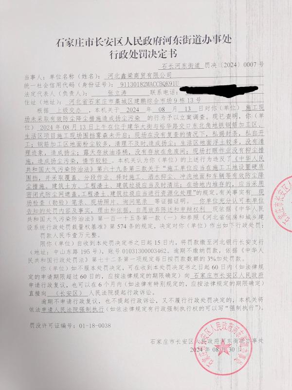 上级交办。2024年8月13日上午,我街道综合行政执法队执法人员第一时间赶到现场,检查发现河北鑫梁商贸有限公司承建的位于建华大街与裕华路交口东北角地铁钢筋加工区、生活区项目施工现场围挡雾森未开启;现场在没有复查的情况下,私揭封条,私自开工;钢筋加工区地面粉尘较多,清理不及时,造成扬尘;生活区地面浮土较多,没有清理迹象,造成扬尘;露天存放油漆桶,没有存放在危废间;现场打眼作业没有抑尘措施,造成扬尘污染,情节较轻。违反了《 中华人民共和国大气污染防治法》第六十九条第三款的规定。依据《 中华人民共和国大气污染防治法》第一百一十五条第一款(一)的规定和参照《河北省住房和城乡建设系统行政处罚裁量权基准》第574条的规定,决定对河北鑫梁商贸有限公司作出罚款人民币壹万元整的行政处罚。