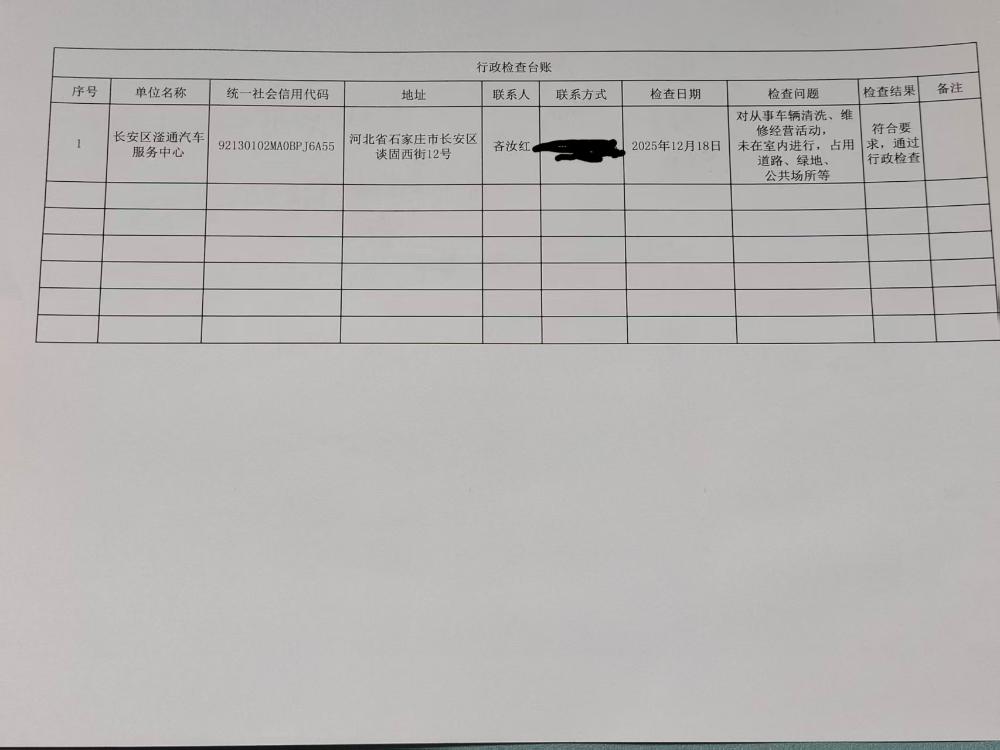 2025年12月18日河东街道综合行政执法队对长安区滏通汽车服务中心进行日常检查,检查当事人对从事车辆清洗、维修经营活动,未在室内进行,占用道路、绿地、公共场所等行为,检查结果长安区滏通汽车服务中心符合要求,通过行政检查。