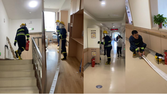 演练活动前,消防队员先向院民和工作人员讲解了灭火器、消防栓、疏散通道、指示标志、应急照明灯等消防器材使用方法和注意事项。上午九点演练正式开始,养老院模拟火灾情境,中心楼3层模拟起火。“着火啦,大家用湿毛巾捂住口鼻,不要慌乱,迅速撤离。”住院老人在护理人员带领、搀扶下,手拿湿毛巾,捂住口鼻,低头前行,有序地通过消防通道,紧急疏散到养老院门口空地。工作人员迅速穿戴好防护装备,与消防队员一起进行扑救。
