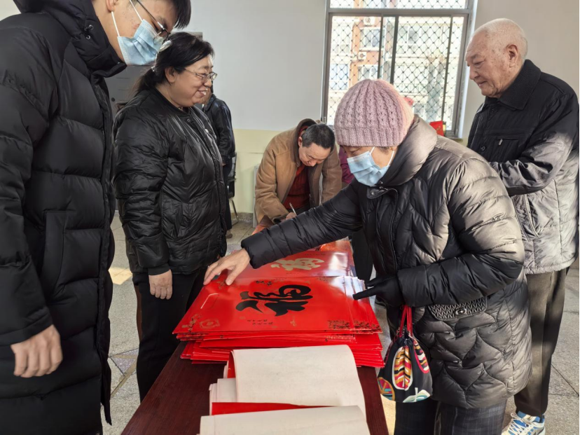 活动现场热闹非凡,充满欢声笑语。铁道大学离退处精心准备了大量寓意吉祥的春联。这些春联内容丰富,“天增岁月人增寿,春满乾坤福满门”祈愿人们健康长寿,生活美满;“盛世和谐添锦绣,新春如意焕光华”则描绘出对盛世新春的美好憧憬。居民们有序排队,脸上洋溢着期待与喜悦。拿到春联和福字的李大妈高兴地说:“这大红春联看着就喜庆,感谢社区和离退处,让年味儿更浓啦!”现场氛围热烈温馨,大家纷纷为此次活动点赞。