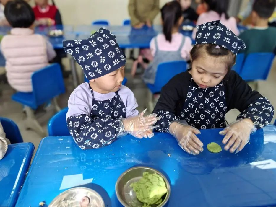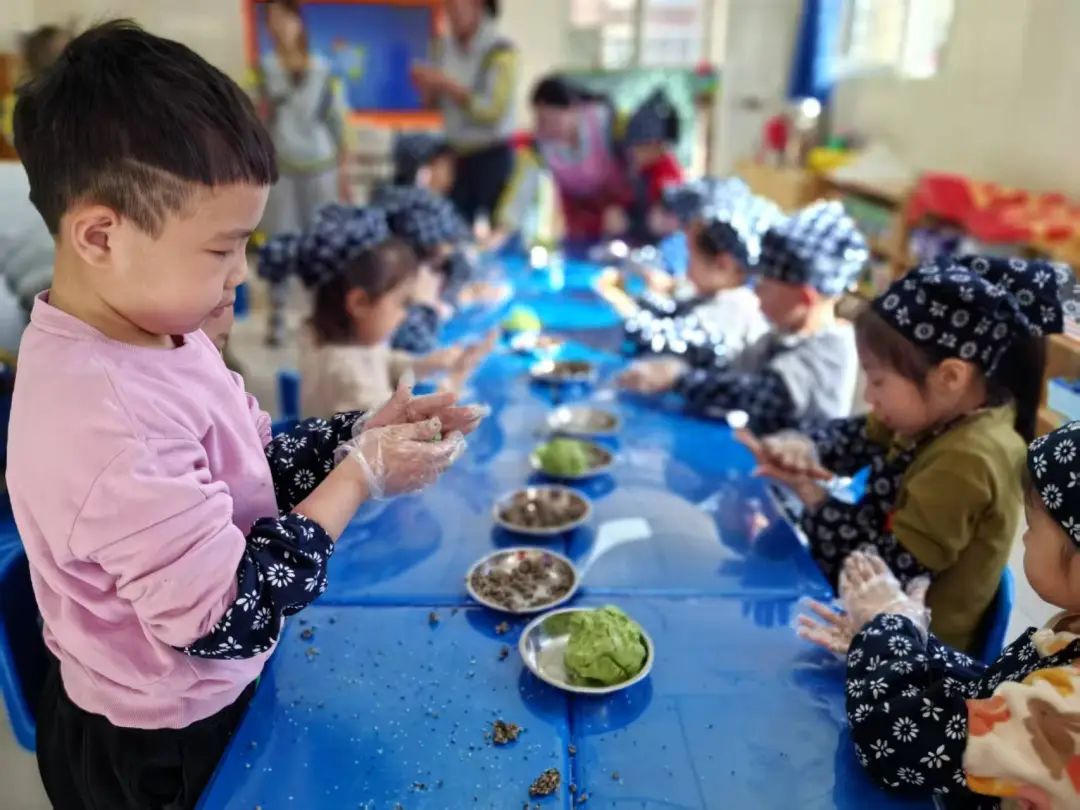 随后,制作青团环节正式开始。社区工作人员和老师们耐心地向孩子们示范制作步骤,看着各种丰富的调料变成一个个圆润的青团,儿童们个个热情高涨,迫不及待地动手尝试,经由他们灵活的小手做出的青团形状各异,大家脸上洋溢着快乐的笑容。在社区工作人员和老师们的悉心指导下,儿童们逐渐掌握了技巧,一个个可爱的青团在他们手中诞生。