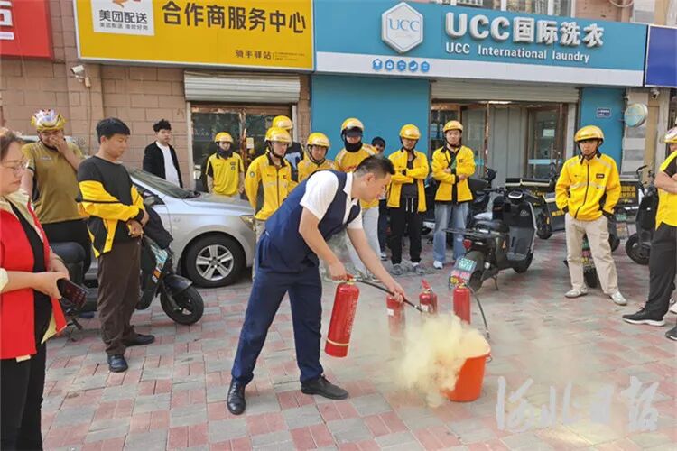 近日,石家庄市长安区胜北街道国赫天著社区联合深科物业,针对快递小哥等新就业群体开展消防技能培训。
