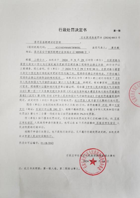 香河县盛都建材经营部于2024年9月29日9时30分,在跃进路与翟营大街交口西北角石煤机城市更新项目内施工时,施工现场存在扬尘污染违法,不符合施工现场作业扬尘污染防治的相关规定。当事人的这一行为,违反了《中华人民共和国大气污染防治法》第六十九条第三款的规定。依据《中华人民共和国大气污染防治法》第一百一十五条相关规定和参照《河北省住房和城乡建设系统行政处罚裁量权基准》(试行)第 575 号对《中华人民共和国大气污染防治法》行政处罚裁量标准的规定,对当事人处以罚款人民币壹万元整的行政处罚。