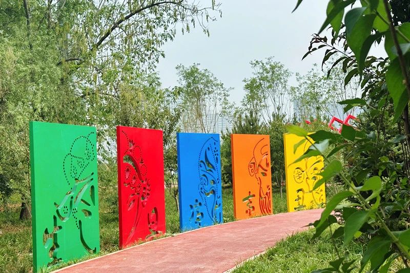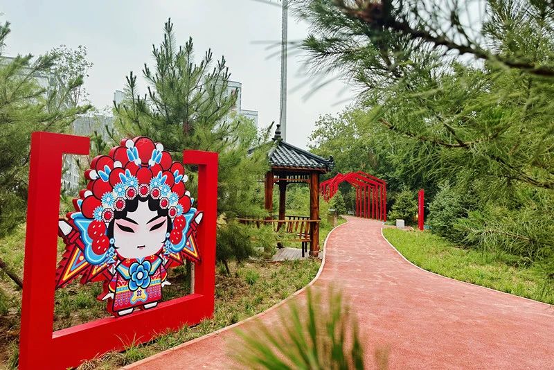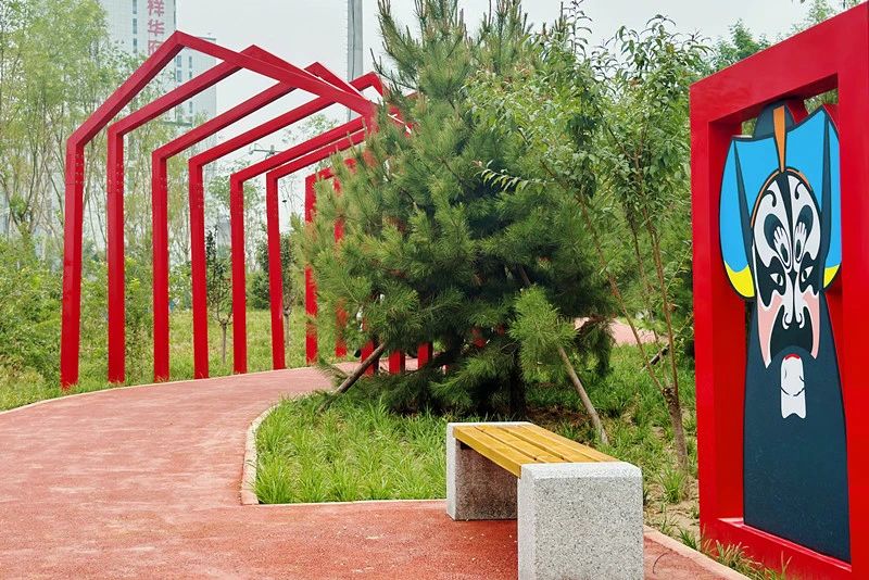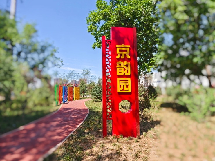 京韵园的设计、建造充分挖掘京剧文化特色,以京剧脸谱为核心载体展开,通过飘逸的180米“水袖”步道对园内“脸谱”雕塑小品进行完美串联,讲述了戏曲的发展历程,融入了戏曲文化元素,形成戏曲文化带。同时,园内设置观景亭廊1座、座椅2组,增植云杉、油松、海棠、碧桃、连翘、金银木等不同色彩的乔灌木337株。配合精致的铺装、舒缓的地形、多彩的植被,整个游园体现出曲径通幽、小巧精致的效果,给市民提供了集观赏、休憩、健身于一体的绿色空间,也达到了宣传我国国粹京剧文化的效果。
