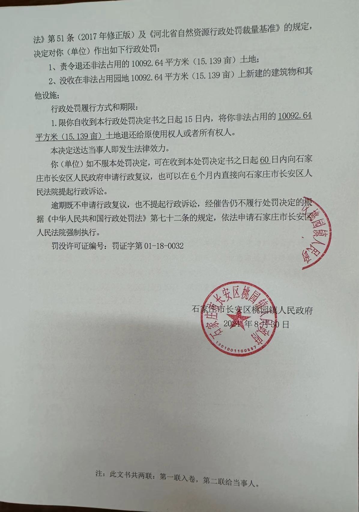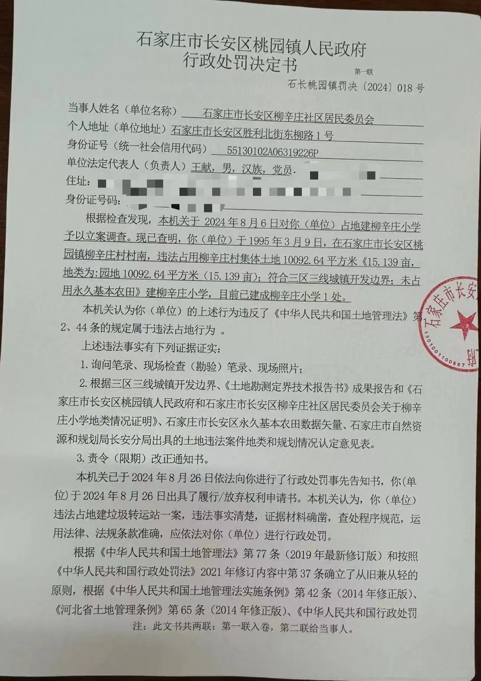 石家庄市长安区柳辛庄社区居民委员会在石家庄市长安区园镇柳辛庄村村南,违法占用柳辛庄村集体土地10092.64平方米《15.139亩,地类为:园地10092.64平方米(15.139亩);符合三区三线城镇开发边界;未占用永久基本农田》建柳辛庄小学,目前已建成柳辛庄小学1处。违反了《中华人民共和国土地管理法》2、44 条的规定,依据《中华人民共和国土地管理法》第77条(2019年最新修订版)和按照《中华人民共和国行政处罚法》2021年修订内容中第 37条确立了从旧兼从轻的原则,根据《中华人民共和国土地管理法实施条例》第42条(2014年修正版)、《河北省土地管理条例》第 65 条(2014 年修正版)、《中华人民共和国行政处罚法》第51条(2017年修正版)及《河北省自然资源行政处罚裁量基准》的规定,对当事单位作出:1、责令退还非法占用的10092.64平方米(15.139亩)土地;2、没收在非法占用园地 10092.64平方米(15.139 亩)上新建的建筑物和其他设施的行政处罚,该当事单位已经限期整改,并在规定时间内退还非法占用的10092.64平方米(15.139亩)土地。