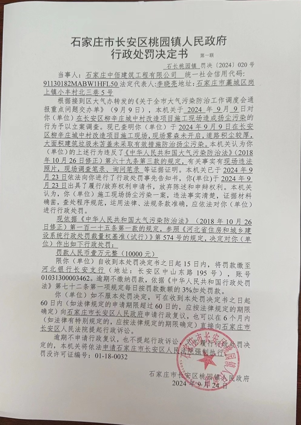 石家庄中佰建筑工程有限公司在长安区柳辛庄城中村改造项目施工现场造成扬尘污染的行为予以立案调查。现已查明你单位在长安区桃园镇柳辛庄城中村改造项目施工现场,现场雾森未开启,道路积尘较厚大面积建筑垃圾未苦盖,未采取有效措施防治扬尘污染。违反了《中华人民共和国大气污染防治法》(2018年修订本)第六十九条第三款的规定,依据《中华人民共和国大气污染防治法》(2018年修订本)第一百一十五条第一款的规定,参照《河北省住房和城乡建设系统行政处罚裁量权基准(试行)》第574号的规定,对当事公司作出责令限期整改、罚款壹万元整(10000元)的行政处罚,该当事公司已经限期整改,并在规定时间内向指定银行缴纳了罚款。
