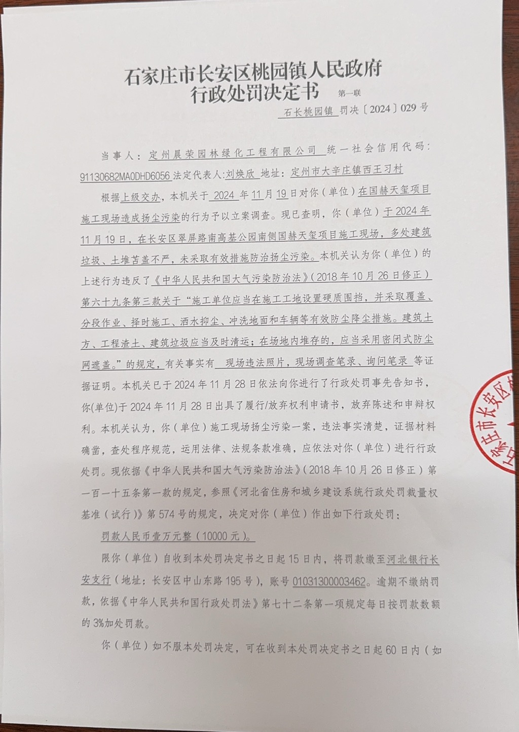定州晨荣园林绿化工程有限公司在长安区国赫天玺项目施工现场造成扬尘污染的行为予以立案调查。现已查明你单位在长安区翠屏路南高基公园南侧国赫天玺项目施工现场,多处建筑垃圾、土堆苫盖不严,未采取有效措施防治扬尘污染。违反了《中华人民共和国大气污染防治法》(2018年修订本)第六十九条第三款的规定,依据《中华人民共和国大气污染防治法》(2018年修订本)第一百一十五条第一款的规定,参照《河北省住房和城乡建设系统行政处罚裁量权基准(试行)》第574号的规定,对当事公司作出责令限期整改、罚款壹万元整(10000元)的行政处罚,该当事公司已经限期整改,并在规定时间内向指定银行缴纳了罚款。