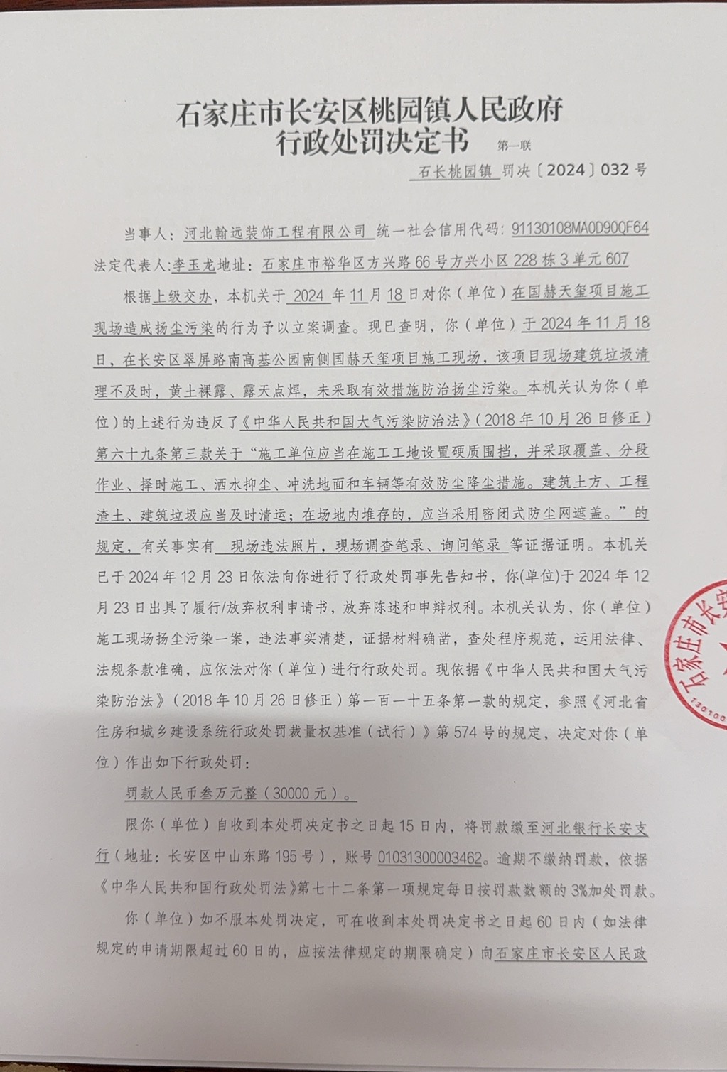 河北翰远装饰工程有限公司在国赫天玺项目施工现场造成扬尘污染的行为予以立案调查。现已查明你单位在长安区志远路与祥华街交口西南角国赫天玺项目施工现场,该项目现场建筑垃圾清理不及时,黄土裸露、露天点焊,未采取有效措施防治扬尘污染。违反了《中华人民共和国大气污染防治法》(2018年修订本)第六十九条第三款的规定,依据《中华人民共和国大气污染防治法》(2018年修订本)第一百一十五条第一款的规定,参照《河北省住房和城乡建设系统行政处罚裁量权基准(试行)》第574号的规定,对当事公司作出责令限期整改、罚款叁万元整(30000元)的行政处罚,该当事公司已经限期整改,并在规定时间内向指定银行缴纳了罚款。
