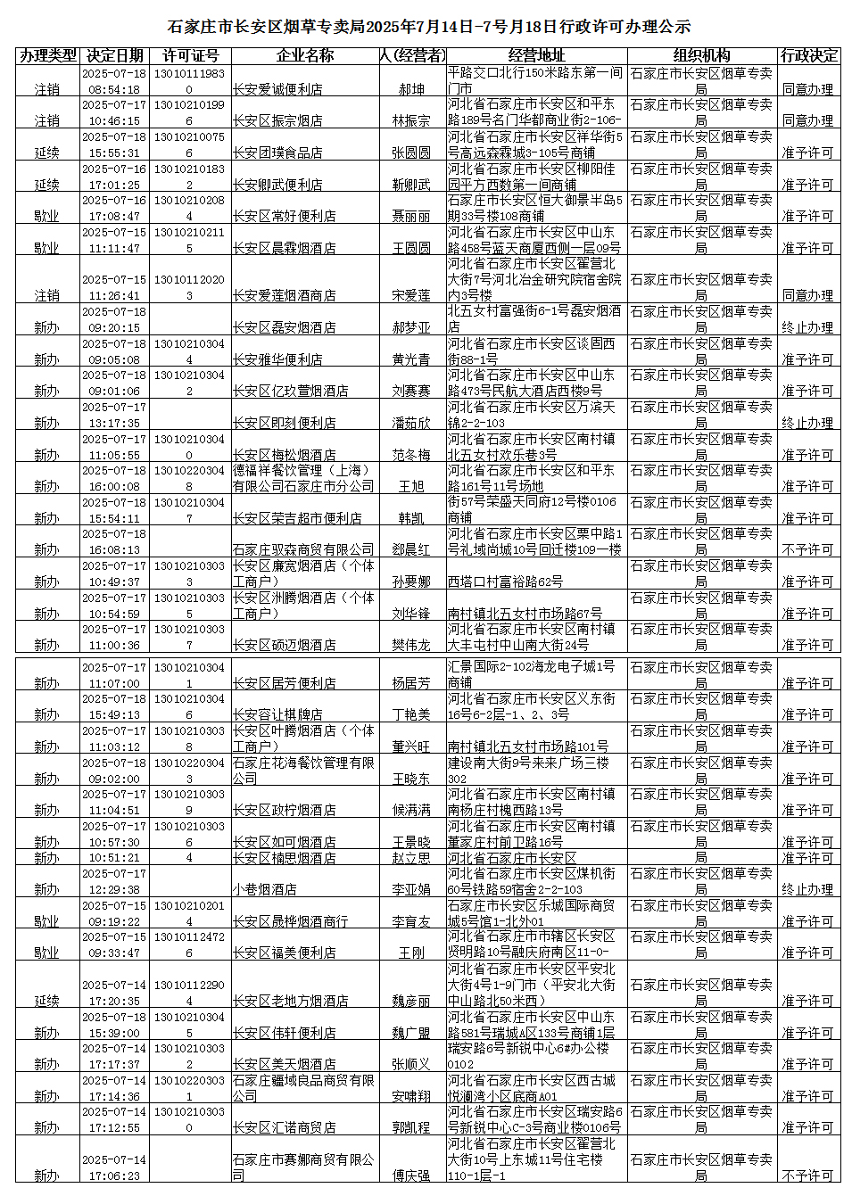 石家庄市长安区烟草专卖局2025年7月14日-7号月18日行政许可办理公示