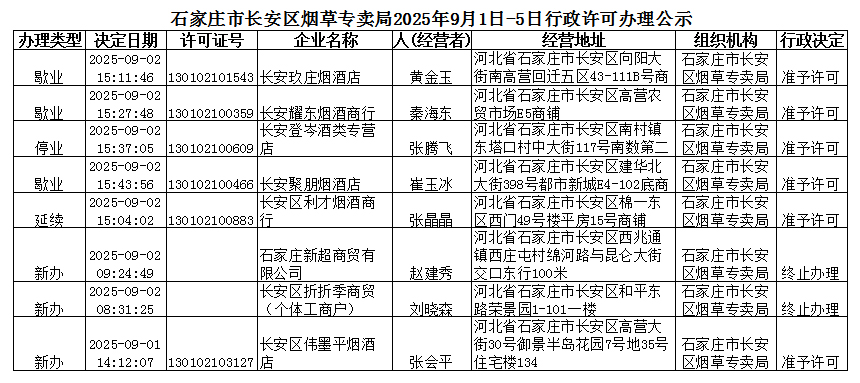 石家庄市长安区烟草专卖局2025年9月1日-5日行政许可办理公示
