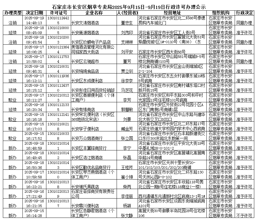 石家庄市长安区烟草专卖局2025年9月15日-9月19日行政许可办理公示