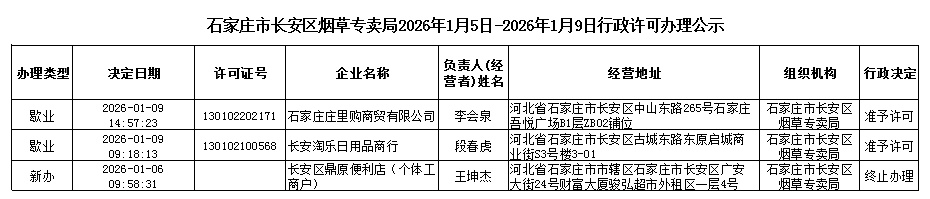 石家庄市长安区烟草专卖局2026年1月5日-2026年1月9日行政许可办理公示